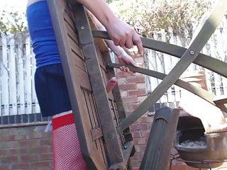 Amateur Crossdresser in Fishnets bei der Outdoor Selbstbefiedigung auf seine eigene weise
